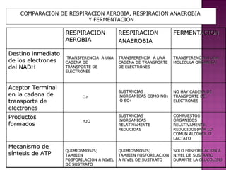 El documento compara tres procesos metabólicos: la respiración aerobia, la respiración anaerobia y la fermentación. La respiración aerobia utiliza oxígeno como aceptor final de electrones, mientras que la respiración anaerobia utiliza sustancias inorgánicas y la fermentación no tiene cadena de transporte de electrones. La respiración aerobia y anaerobia generan ATP a través de la fosforilación oxidativa, mientras que la fermentación solo usa la fosforilación en el nivel de sustrato. El