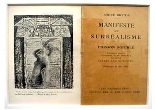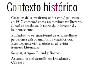 El documento resume la historia y características principales del surrealismo en la fotografía y el cine. El surrealismo surgió como un movimiento literario en 1917 basado en lo irracional e inconsciente, influenciado por el psicoanálisis de Freud. Andre Breton fue el principal teórico con sus manifiestos surrealistas de 1924 y 1929. La fotografía y el cine surrealistas se caracterizaron por el automatismo psíquico, uniones absurdas, tiempos y espacios ambiguos, y la fantasía onírica. Artistas cl