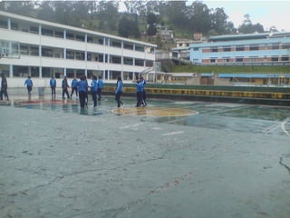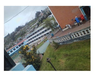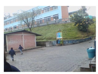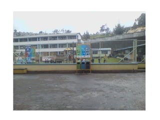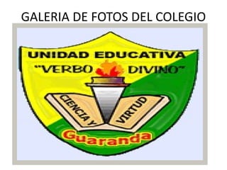 Este documento presenta una galería de fotos de varios lugares del colegio, incluyendo la entrada principal, el aula de informática, estudiantes usando el uniforme escolar, áreas de compañerismo, el jardín, la subida al coliseo, y tachos de basura. Las fotos muestran diferentes aspectos del establecimiento educativo.