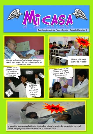 Este documento presenta un resumen de 3 oraciones de la fotonovela "Mi casa". Describe que la fotonovela fue creada por el grupo de trabajo de la Escuela Municipal 1 de Puerto Madryn, Chubut. Cuenta la historia de un niño llamado Nahuel que le describe a su maestra y compañeros cómo es su casa pero desaparece misteriosamente, dejando a todos intrigados por conocer su hogar.