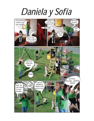 Este documento es una fotonovela que cuenta la historia de Daniela y Sofía. Daniela se siente aburrida y triste después de la muerte de su amiga Sofía. Dos meses después, Daniela culpa a sí misma por la muerte de Sofía y considera suicidarse. Sin embargo, el espíritu de Sofía se le aparece y la convence de seguir viviendo, prometiéndole que la cuidará desde el cielo. Daniela acepta continuar viviendo gracias al apoyo y consejo de su amiga Sofía.