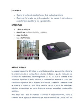 Este documento presenta un experimento sobre espectrofotometría. El objetivo era conocer cómo usar un espectrofotómetro y analizar datos. Se midió la absorbancia de varias soluciones a diferentes longitudes de onda y concentraciones. Los resultados se graficaron y ajustaron con la ley de Beer-Lambert para determinar las concentraciones óptimas.