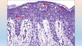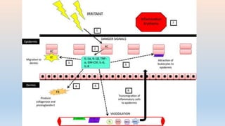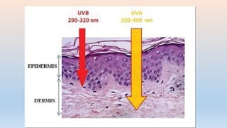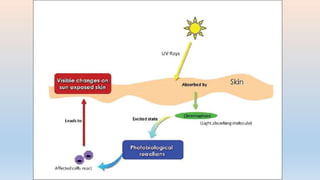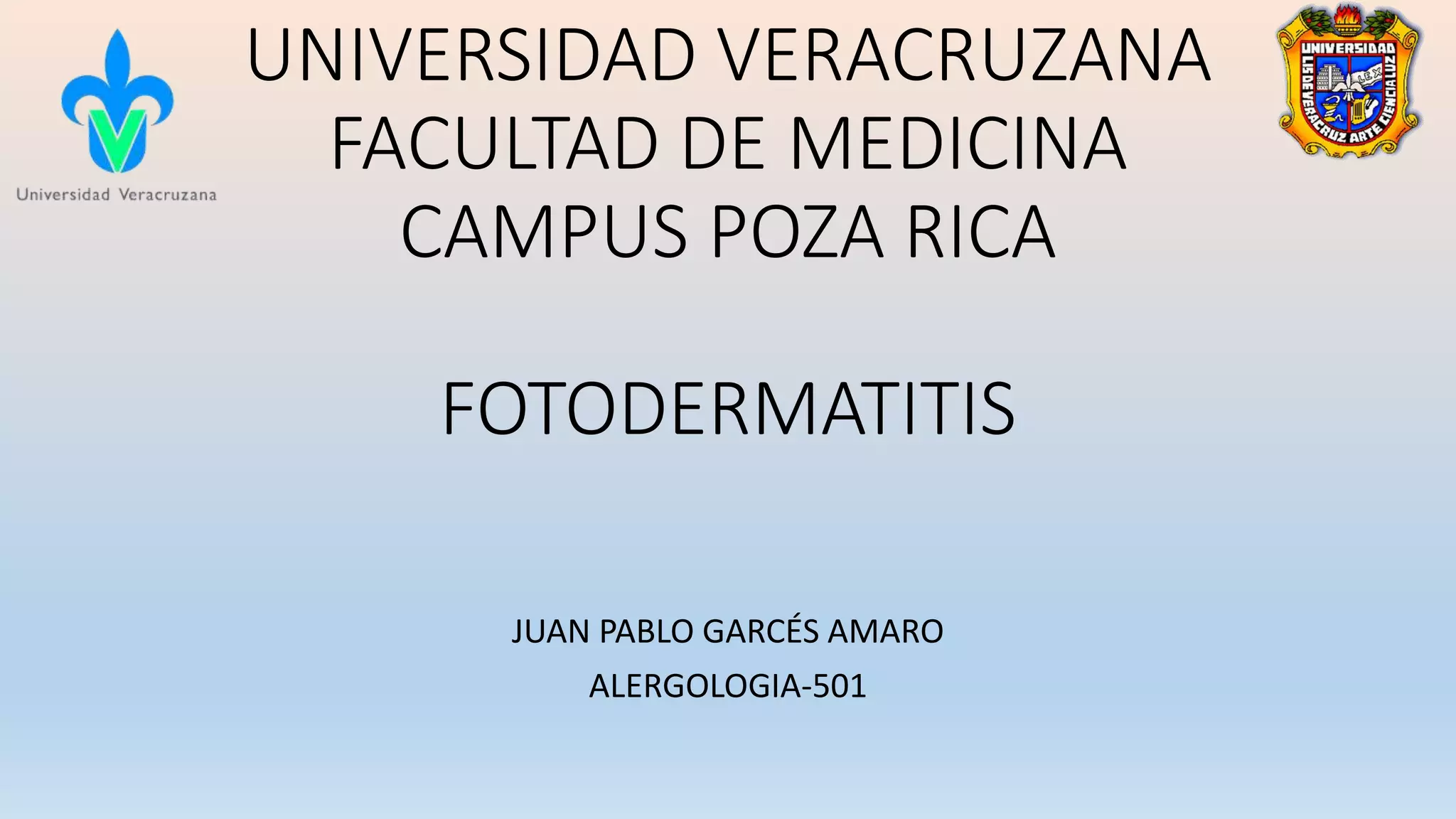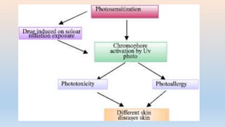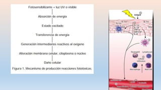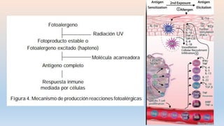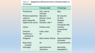 Este documento presenta dos casos de fotodermatitis. El primer caso describe a un paciente masculino de 45 años con lesiones similares a quemaduras solares después de aplicar diclofenaco tópico y exponerse al sol. El segundo caso describe a una paciente femenina de 65 años con irritación y picazón en el cuello después de aplicar un cosmético y exponerse al sol. El documento también discute los tipos de fotodermatitis, incluidas las fototóxicas y fotoalérgicas, y ofrece posibles diagnó