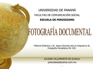 El documento presenta un enfoque sobre la fotografía documental como herramienta de comunicación social, resaltando su importancia en la representación de realidades sociales y su capacidad para generar conciencia crítica. Se exploran conceptos, antecedentes y objetivos del documentalismo fotográfico, destacando su distinción del fotoperiodismo. Además, se incluyen ejemplos históricos y la obra de fotógrafos significativos, como Joe O'Donnell y Robert Capa, que documentaron eventos de gran trascendencia humana.