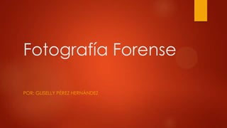 La fotografía forense es una rama de la criminalística que utiliza técnicas fotográficas para documentar evidencia en escenas del crimen y apoyar investigaciones. El perito fotográfico debe capturar detalles del lugar de los hechos con precisión utilizando diferentes tipos de vistas, lentes y técnicas. La fotografía forense provee registros permanentes que son útiles para examinar documentos, huellas digitales y otros tipos de evidencia.