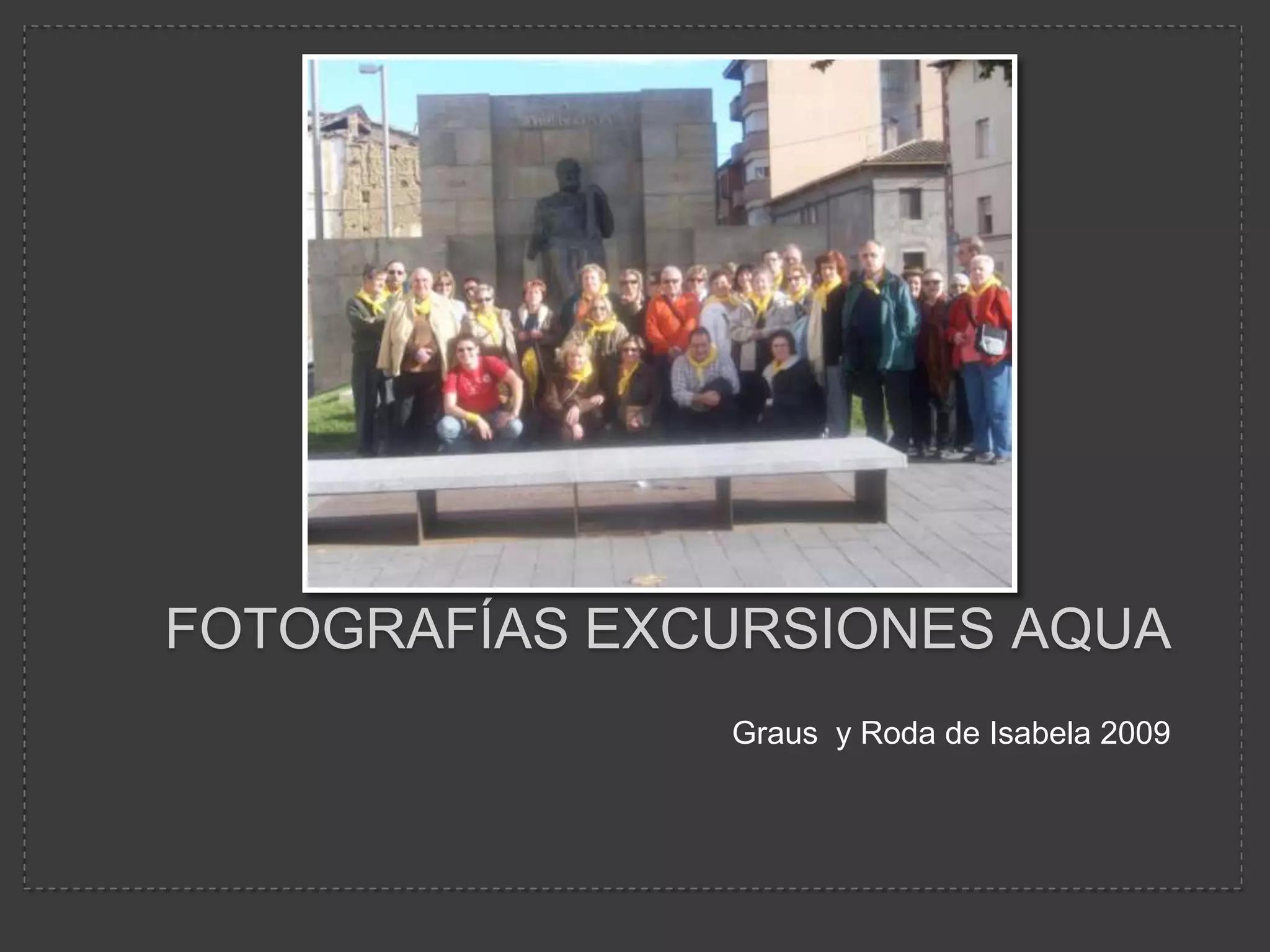El documento describe una excursión en 2009 a Graus y Roda de Isabela, donde el grupo paseó por las calles con un guía. Durante el recorrido, se proporcionaron explicaciones sobre los lugares visitados, destacando la experiencia compartida. La mención de Joaquín Costa en Graus sugiere un aspecto cultural o histórico del lugar.