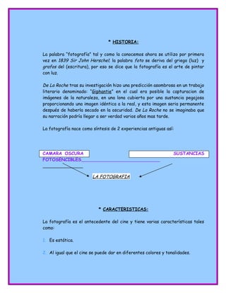 El documento resume la historia y características de la fotografía. Se describe cómo surgió a partir de la cámara oscura y sustancias fotosensibles. También explica que la fotografía tiene diversos usos científicos como capturar fenómenos rápidos o lentos. Finalmente, resume varios tipos de fotografía como la artística, de retratos, guerra, paisajes y glamour.