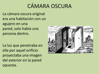 La historia de la fotografía comenzó con la cámara oscura y evolucionó hacia una caja portátil con lente. En el siglo XIX, Niépce y Daguerre desarrollaron procesos para fijar imágenes de manera permanente, dando origen a la fotografía moderna. En el siglo XX, las cámaras de 35 mm y la película en rollo impulsaron su popularidad, mientras que avances como la fotografía en color permitieron nuevas aplicaciones en reportaje, publicidad y arte.