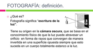 Este documento define la fotografía como la "escritura de la luz" y explica sus orígenes en la cámara oscura. Describe las propiedades básicas de la luz y las partes clave de una cámara, incluido el obturador que controla el paso de la luz y el diafragma que controla la cantidad de luz. También explica que la intensidad de la luz que entra en una cámara está determinada por la abertura del diafragma y el tiempo que el obturador deja pasar la luz.