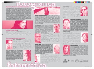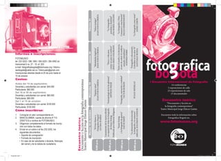 El documento presenta la información sobre Fotográfica Bogotá, un encuentro organizado por el Fotomuseo para celebrar sus 5 años de funcionamiento. Incluye más de 20 exposiciones de fotografía, 13 conferencias por pensadores nacionales e internacionales sobre fotografía documental y ficción, y un homenaje a Susan Sontag. También presenta breves biografías de los conferencistas.