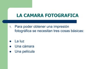El documento describe los componentes básicos de una cámara fotográfica, incluyendo la luz, la cámara y la película. Explica que la cámara es una caja a prueba de luz con un lente que capta la luz reflejada y la proyecta sobre la película para formar la imagen. También describe los componentes clave de la cámara como el diafragma, obturador y mecanismo de avance de película, así como los tipos de película y flash.