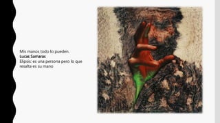 Este documento presenta resúmenes en 3 oraciones o menos de varias fotografías realizadas por diferentes fotógrafos. Cada resumen describe brevemente el mensaje o significado subyacente de la fotografía a través del uso de figuras retóricas como metáfora, metonimia, gradación y doble sentido. Los fotógrafos incluyen Lucas Samaras, Helmut Newton, Erwitt Elliott y Annie Leibovitz.