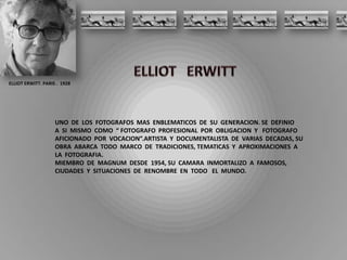 El documento presenta breves biografías de cuatro fotógrafos emblemáticos: Elliot Erwitt, Chema Madoz, Guido Argentini y Annie Leibovitz. Describe a Erwitt como uno de los fotógrafos más icónicos de su generación conocido por retratar famosos y ciudades en todo el mundo. Explica que Madoz es uno de los creadores más destacados de la fotografía española contemporánea conocido por sus imágenes sutiles y juegos metafóricos. Señala que Argentini es