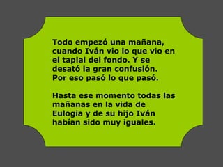 Iván ve una rata muerta en el tapial de su casa, lo que causa gran confusión. Llegan vecinos y servicios de emergencia. Se descubre que la rata sigue viva y escapa. Eulogia y Feliciano corren detrás de la rata y los vecinos los persiguen, creando más confusión. Al final, la enamorada del muro, la rata, sigue viva y el viento juega con ella.