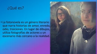La fotonovela es un género literario que narra historias de amor y drama a través de fotografías en lugar de dibujos. Surge en Italia en 1947 y se extiende a otros países, aunque su popularidad decayó en la década de 1980. Se caracteriza por contar historias sentimentales de forma secuenciada mediante imágenes fotográficas y textos, y utiliza bocadillos y otras técnicas para expresar los diálogos y pensamientos de los personajes estereotipados.