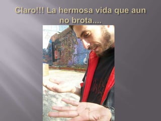 El documento habla sobre el nacimiento de la vida a través de la naturaleza. Describe cómo la vida puede brotar con la ayuda de la madre tierra y los rayos del sol, dando lugar al nacimiento de frutos y familias. Sin embargo, no todos aman y respetan a la madre naturaleza.