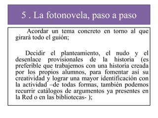 El documento explica qué es una fotonovela y cómo crear una. Una fotonovela cuenta una historia a través de una secuencia de imágenes fijas y texto. Explica las cinco fases del proceso de creación de una fotonovela: 1) elegir un tema, 2) crear un argumento, 3) escribir un guión literario, 4) crear un guión técnico, 5) tomar fotografías y componer la fotonovela.