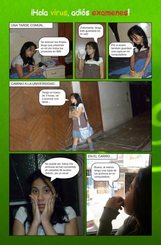 El documento cuenta la historia de una estudiante llamada Evane cuya USB fue infectada con un virus, borrando todos sus archivos de proyectos y tareas. Sus intentos por recuperar los archivos con la ayuda de un amigo y en una cabina pública no tuvieron éxito. Finalmente, le contó honestamente a su profesora sobre la situación, quien le informó que tenía copias de seguridad de sus avances.