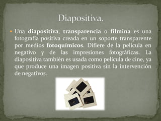 El documento habla sobre las diapositivas y su proceso de creación. Explica que son fotografías positivas creadas en un soporte transparente y que se usan comúnmente en presentaciones. También menciona que las diapositivas de Kodachrome son conocidas por su durabilidad y colores vibrantes que no se desvanecen con el tiempo. Por último, resume los pasos básicos del proceso E-6 para revelar diapositivas de color.