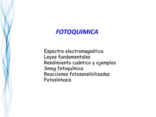 Este documento trata sobre la fotoquímica. Explica el espectro electromagnético, las leyes fundamentales de la fotoquímica, el rendimiento cuántico y ejemplos. También describe el smog fotoquímico, las reacciones fotosensibilizadas y la fotosíntesis.