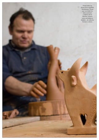 Este documento describe la vida y carrera del ceramista Antonio Hernansanz. Hernansanz lleva 43 años dedicado a la cerámica en Cuenca, habiendo aprendido el oficio de su tío a una edad temprana. Aunque disfruta creando piezas tradicionales como jarrones y platos representando las Casas Colgadas de Cuenca, también ha innovado con nuevas técnicas y colores. Hernansanz encuentra gran satisfacción en su trabajo creativo con barro y ve a la cerámica como parte integral de la cultura de Cuenca