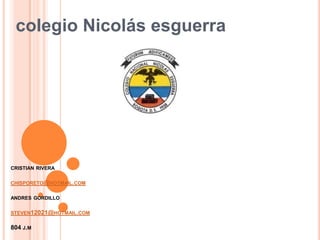 Este documento proporciona información sobre varios estudiantes del colegio Nicolás Esguerra, incluyendo sus nombres, correos electrónicos y temas sobre cómo usar Microsoft PowerPoint como cerrar presentaciones, crear y guardar presentaciones, trabajar con diapositivas, texto, tablas, gráficos y más.