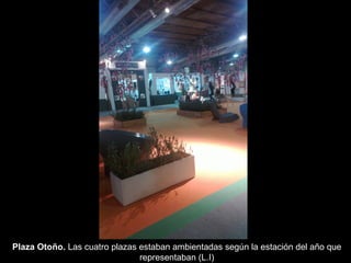 El documento describe diferentes secciones de una feria de arte y diseño, incluyendo cuatro plazas decoradas según las estaciones, una exhibición de vacas decoradas, un auditorio con música y barra, un stand de exposición de arte, y carros de compras como una nueva tendencia; también menciona un stand con productos importados de Medio Oriente que tuvo problemas de stock.