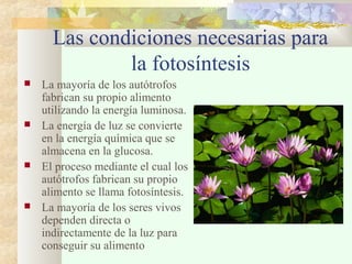 La fotosíntesis es el proceso mediante el cual las plantas y otros organismos autótrofos utilizan la luz solar, dióxido de carbono y agua para producir glucosa rica en energía. La clorofila, un pigmento verde, absorbe la energía de la luz y la convierte en energía química almacenada en la glucosa. Este proceso complejo ocurre en los cloroplastos y consta de dos fases: las reacciones dependientes de la luz, donde se produce ATP, y las reacciones independientes de la luz,