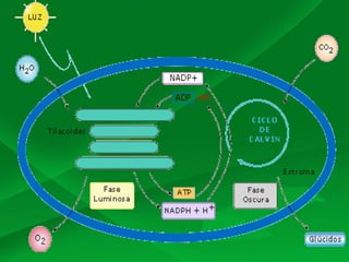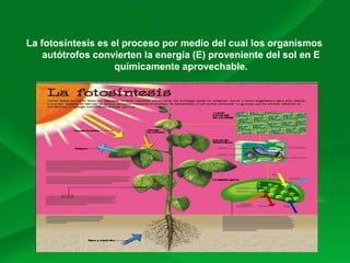 La fotosíntesis convierte la energía del sol en energía química utilizable mediante procesos que ocurren en los cloroplastos de las plantas y otros organismos autótrofos. La fotosíntesis consta de dos fases: la fase luminosa, que requiere luz, y la fase oscura o ciclo de Calvin, que no requiere luz y usa el CO2 atmosférico para formar glucosa. El oxígeno en la atmósfera terrestre es un indicador de la presencia de vida fotosintética, y
