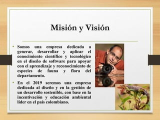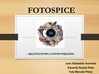 Fotospice es una empresa dedicada al desarrollo de software de reconocimiento fotográfico de especies de flora y fauna. Su misión es generar conocimiento científico y tecnológico para apoyar el aprendizaje y reconocimiento de especies en el departamento. Su idea principal es un software que analiza automáticamente las características de especies en fotografías y proporciona información sobre ellas. El software satisfaría las necesidades del sector educativo, agrícola, legislativo y comercial.