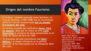 El documento describe el movimiento artístico del fovismo (fauvismo), caracterizado por el uso provocativo del color. Surgió en 1905 en París y su nombre proviene del crítico Louis Vauxcelles, quien calificó las obras presentadas en el Salón de Otoño como "fieras" por su expresión intensa y diferente. Henri Matisse fue el precursor del movimiento, que se centró en la liberación del color y los contrastes cromáticos por encima del dibujo. Otro artista importante fue André Derain.