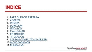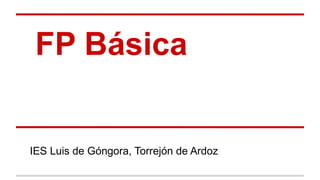 Este documento proporciona una introducción a la Formación Profesional Básica (FP Básica), incluyendo su propósito de preparar a estudiantes para una carrera profesional, los requisitos de acceso, la oferta de módulos, la duración de dos años, los procesos de evaluación y promoción, y las opciones posteriores disponibles después de completar el título de FP Básica.