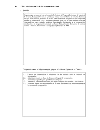 Este documento presenta el programa formativo de la asignatura Fundamentos de Programación dictada en la Universidad Católica de Santa María. Incluye la identificación académica de la asignatura, su lineamiento académico profesional, y la programación por fases de aprendizaje. La asignatura pertenece a la carrera de Ingeniería de Sistemas y busca capacitar a los estudiantes en la resolución de problemas mediante la programación orientada a objetos utilizando Java. El programa se estructura en tres fases que abarcan tem