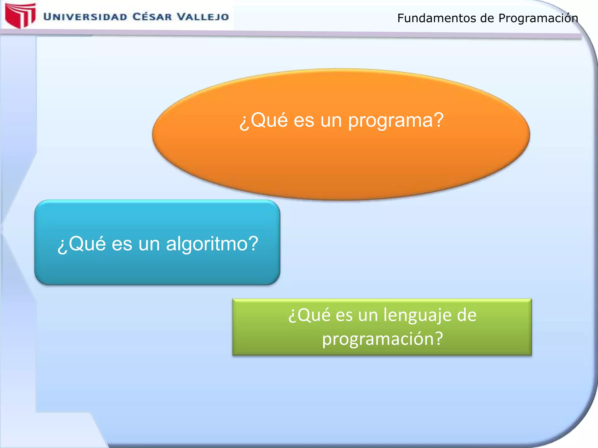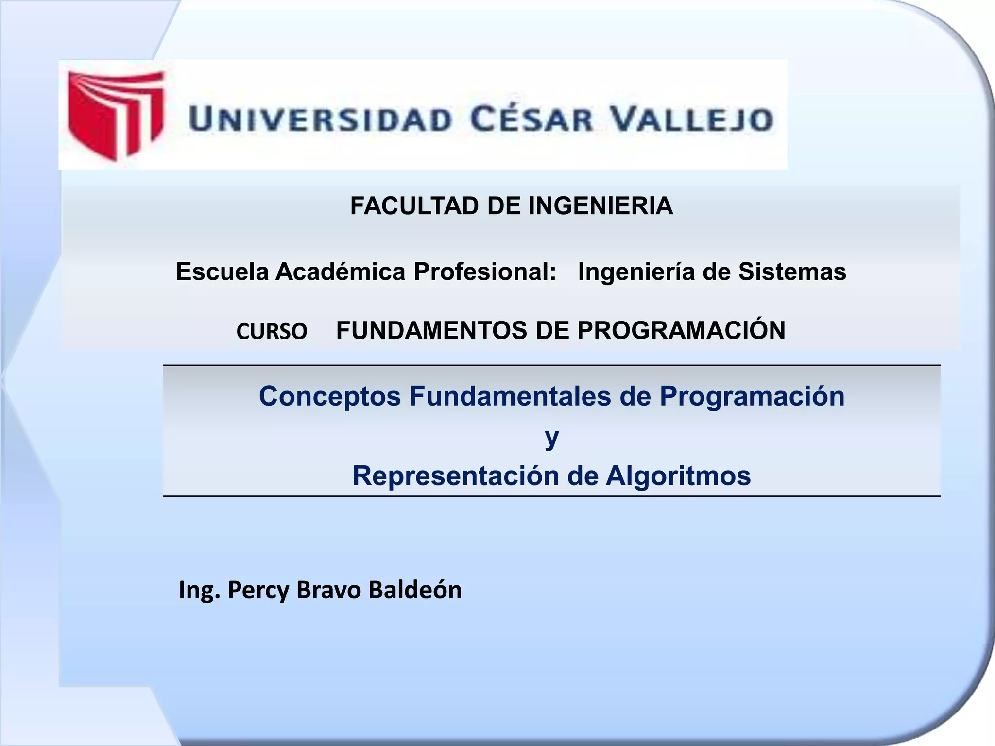 Este documento presenta conceptos fundamentales de programación y algoritmos. Explica qué es un algoritmo, sus características y cómo se representan. También describe conceptos básicos como variables, constantes, tipos de datos, operadores y expresiones. Finalmente, detalla herramientas para el diseño de algoritmos como diagramas de flujo y pseudocódigo.