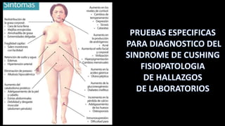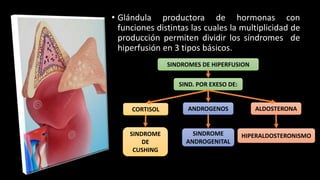 Este documento describe los síndromes de hiperfunción suprarrenal, incluyendo el síndrome de Cushing. El síndrome de Cushing se produce por un exceso de cortisol y puede deberse a una hiperplasia suprarrenal, un tumor suprarrenal o un estímulo excesivo de la hormona ACTH no proveniente de la hipófisis. Sus manifestaciones clínicas incluyen obesidad central, debilidad muscular, osteoporosis, diabetes e hipertensión arterial.
