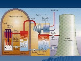 Este documento describe la energía nuclear, incluyendo su definición y origen, el funcionamiento de las centrales nucleares, las reacciones nucleares de fisión y fusión, las ventajas e inconvenientes de la energía nuclear, y algunas curiosidades. Explica que la energía nuclear proviene de reacciones nucleares que liberan partículas energéticas que se convierten en energía térmica para generar electricidad. Describe los procesos de fisión y fusión nuclear y cómo funcionan las centrales para producir vapor y mover turbinas para generar electricidad.