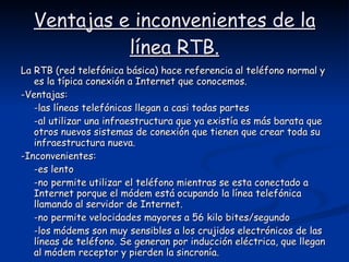 Este documento describe las ventajas e inconvenientes de la línea RTB (red telefónica básica) para conexión a Internet, así como un esquema de cómo funciona una conexión ADSL. También explica los pasos para configurar una red local conectando varios ordenadores a un router a través de Wi-Fi, asignando a cada ordenador una dirección IP y nombre de grupo de trabajo.