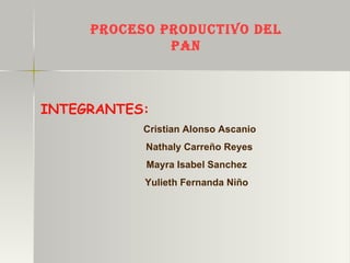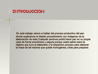 Este documento describe el proceso de producción del pan en 3 oraciones. Explica los ingredientes necesarios como harina, levadura, sal y agua tibia. Luego detalla los pasos de la preparación que incluyen mezclar los ingredientes, amasar la masa hasta que quede elástica, dejarla reposar para que duplique su volumen, darle forma y hornearla a 220°C por 20 minutos y luego a 190°C por 15 minutos más. Finalmente, invita a probar la primera rebanada con un chorrito de aceite.