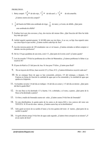Este documento contiene 15 problemas de fracciones que involucran cálculos y conversiones de fracciones. Los problemas cubren temas como: calcular fracciones de cantidades, determinar fracciones equivalentes, resolver fracciones de áreas, volúmenes, tiempos y precios. Los estudiantes deben demostrar su comprensión de las fracciones resolviendo estos problemas paso a paso.