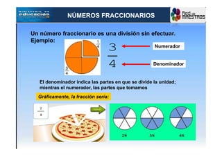 Este documento resume los conceptos básicos de las fracciones. Explica que una fracción es una división sin efectuar, donde el numerador indica las partes que se toman y el denominador las partes en que se divide la unidad. Luego clasifica las fracciones en propias, iguales a la unidad e impropias, y describe cómo encontrar fracciones equivalentes mediante la multiplicación o división del numerador y denominador por el mismo número. Finalmente, detalla los procedimientos para sumar y restar fracciones con igual o distinto denominador.