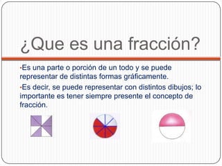 Este documento explica qué son las fracciones y cómo se representan. Las fracciones se forman dividiendo un objeto en partes iguales, donde el numerador indica cuántas partes se toman y el denominador indica en cuántas partes se dividió el objeto original. También explica cómo obtener fracciones equivalentes multiplicando o dividiendo el numerador y denominador por el mismo número.