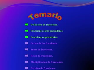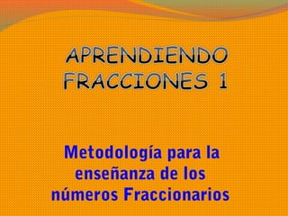 Este documento presenta una metodología para la enseñanza de los números fraccionarios. Explica conceptos básicos como la definición de fracciones, fracciones equivalentes, el orden de fracciones, y operaciones como suma, resta y multiplicación de fracciones. También incluye ejemplos visuales de fracciones como 1/2, 1/4 y su representación numérica.
