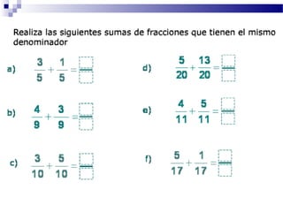 El documento explica los términos básicos de las fracciones como numerador y denominador. El numerador indica el número de partes tomadas de la unidad mientras que el denominador indica en cuántas partes iguales se divide la unidad. Luego describe cómo leer fracciones al mencionar primero el numerador y luego el denominador, y finalmente introduce los tipos de fracciones como propia, impropia e igual a la unidad.