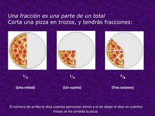 Una fracción representa una parte de un total dividido en partes iguales. Una fracción se escribe como numerador sobre denominador, donde el numerador indica cuántas partes se tienen y el denominador indica en cuántas partes se dividió el total. Se pueden sumar fracciones si tienen el mismo denominador sumando sus numeradores, o convertir fracciones a un denominador común para poder sumarlas.