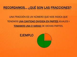 Las fracciones son números que indican una cantidad dividida en partes iguales. Una fracción tiene dos partes: el numerador, que indica cuántas partes se toman de la unidad, y el denominador, que indica en cuántas partes iguales se divide la unidad. Existen diferentes tipos de fracciones como propias, impropias, unitarias e irreducibles.