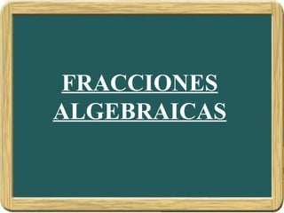 El documento trata sobre fracciones algebraicas, explicando su representación como cocientes de polinomios y las condiciones para que sean equivalentes. Se abordan conceptos de simplificación, ampliación, y operaciones de suma, resta, multiplicación y división de fracciones algebraicas, junto con sus propiedades algebraicas. Además, se discute la irreductibilidad de fracciones y cómo se pueden simplificar mediante el máximo común divisor.