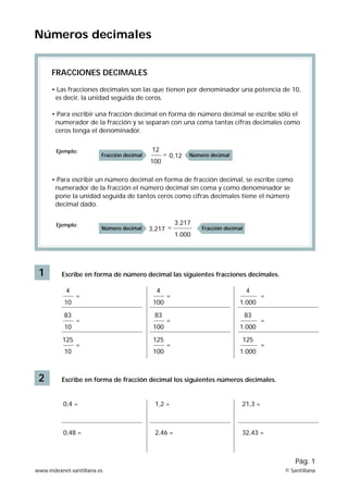 Este documento explica las fracciones decimales y cómo convertir entre fracciones decimales y números decimales. Las fracciones decimales tienen un denominador que es una potencia de 10, mientras que las fracciones ordinarias tienen un denominador que no es una potencia de 10. El documento proporciona ejemplos de cómo escribir fracciones decimales como números decimales y viceversa, así como cómo convertir fracciones ordinarias a números decimales y reducir fracciones decimales a su forma irreducible.