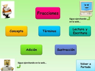 Este documento trata sobre fracciones. Explica que una fracción representa la división de una cantidad total en partes iguales. Incluye ejemplos de dividir objetos como relojes, pasteles, pizzas y manzanas en partes y expresar la cantidad restante o comida como fracciones. También cubre los términos de una fracción, la adición y sustracción de fracciones, y ejercicios prácticos de calcular sumas y restas de fracciones.