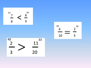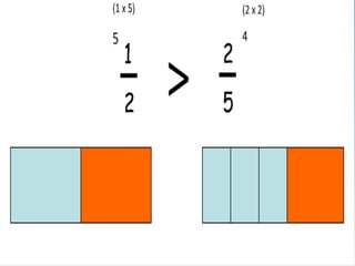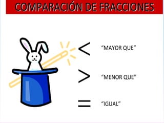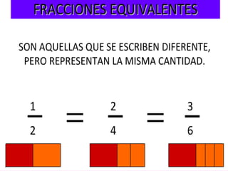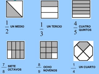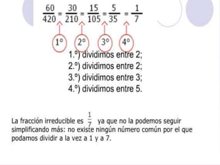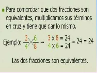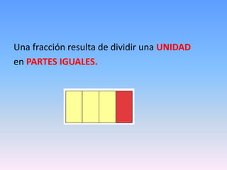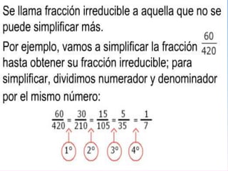 Una fracción representa la división de una unidad en partes iguales, indicando el numerador las partes que se toman y el denominador las partes iguales en que se divide la unidad. Una fracción puede ser menor, igual o mayor que la unidad, y también puede expresarse como un número decimal. Existen diferentes tipos de operaciones con fracciones como obtener fracciones equivalentes multiplicando o dividiendo los términos por el mismo número, simplificar una fracción dividiendo los términos por sus divisores comunes, y comparar fracciones.