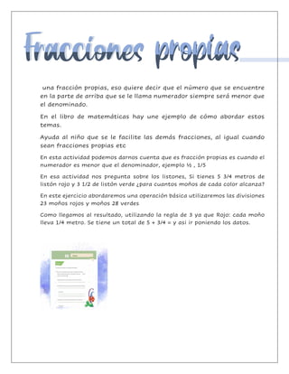 Este documento propone diferentes métodos para enseñar los conceptos de fracciones propias, mixtas e impropias a niños. Explica que las fracciones propias son aquellas donde el numerador es menor que el denominador, mientras que las fracciones impropias son lo contrario, con el numerador mayor que el denominador. También define las fracciones mixtas como aquellas formadas por un número entero y una fracción. Además, proporciona ejemplos de actividades prácticas como dividir listones de colores en porciones iguales para calcular